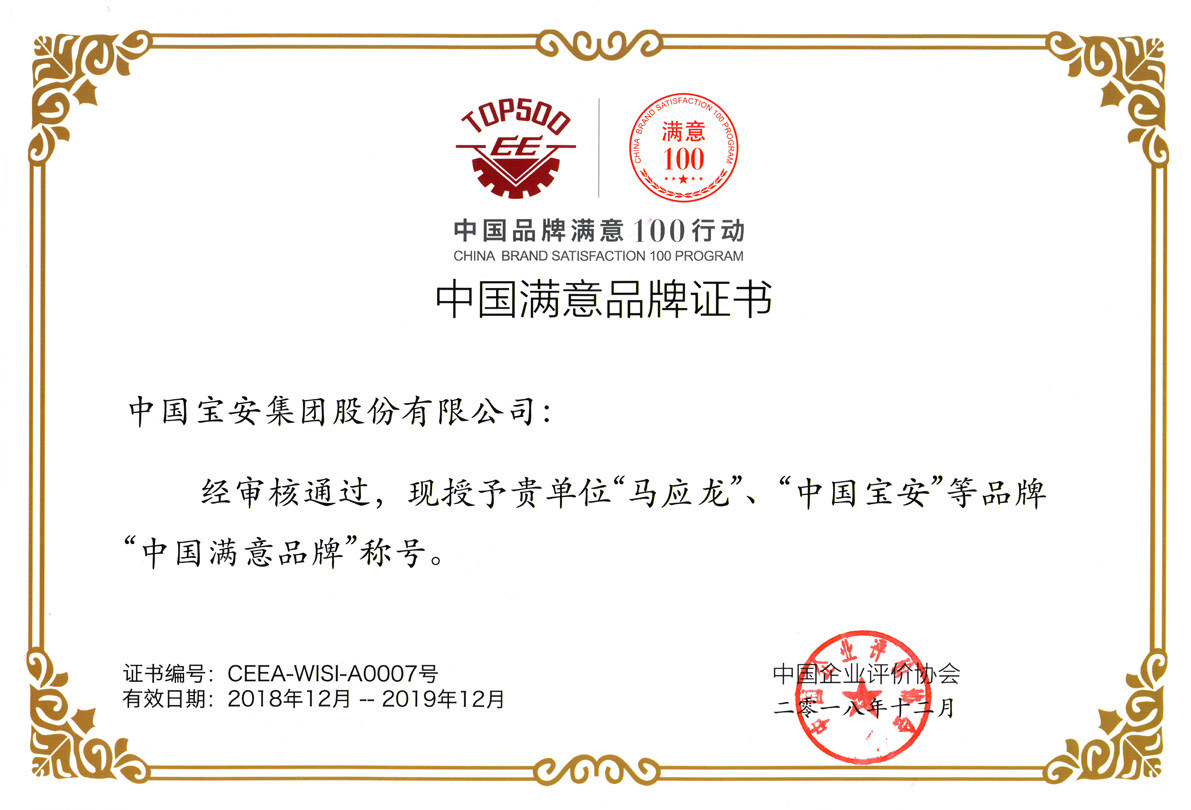 12月8日,首届中国满意品牌高峰论坛在北京钓鱼台国宾馆举行,集团所属“中国宝安”“马应龙”两大品牌荣获“中国满意品牌”称号。集团与中粮集团、北汽集团、深圳航空等32企业成为首批“中国满意品牌”企业。